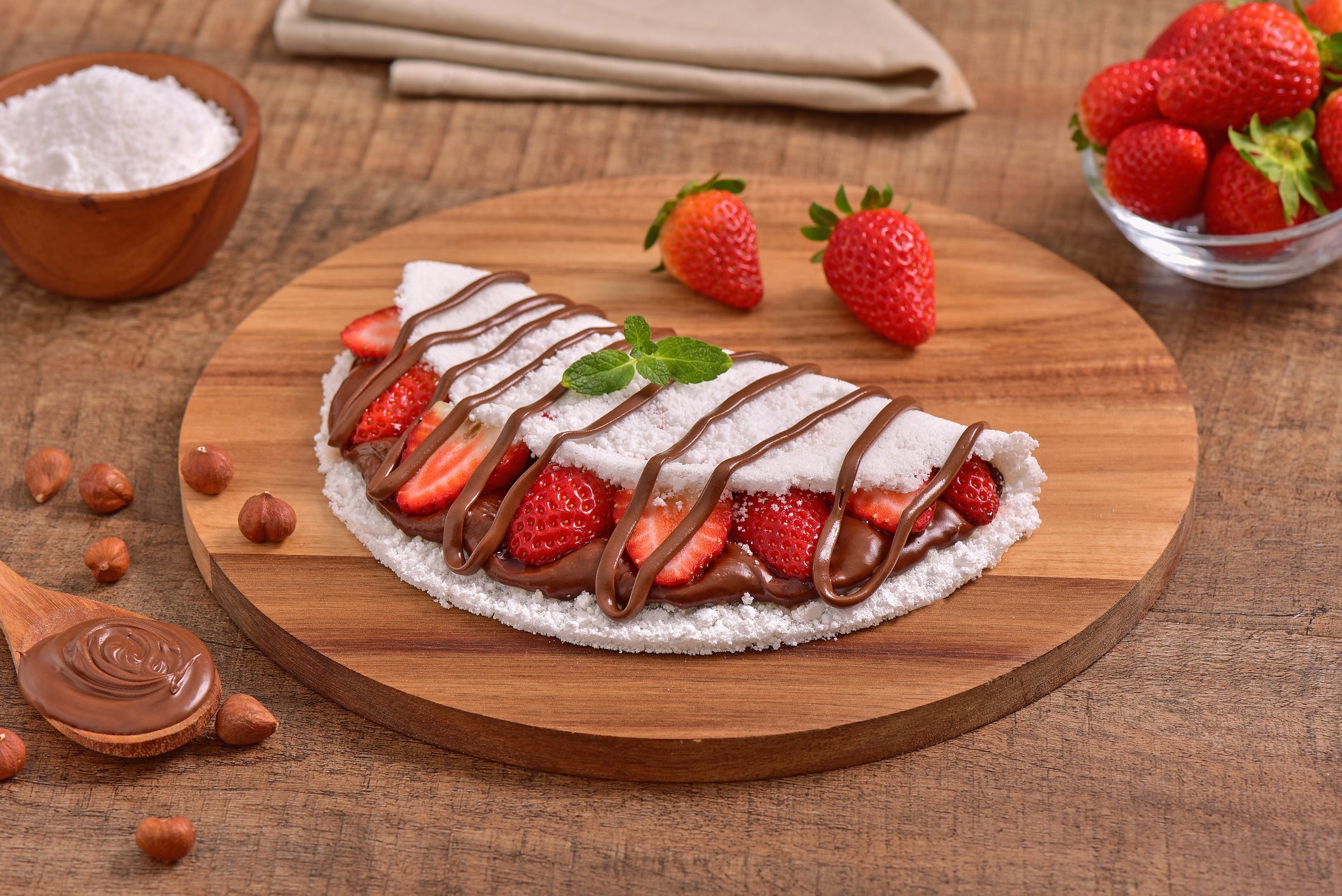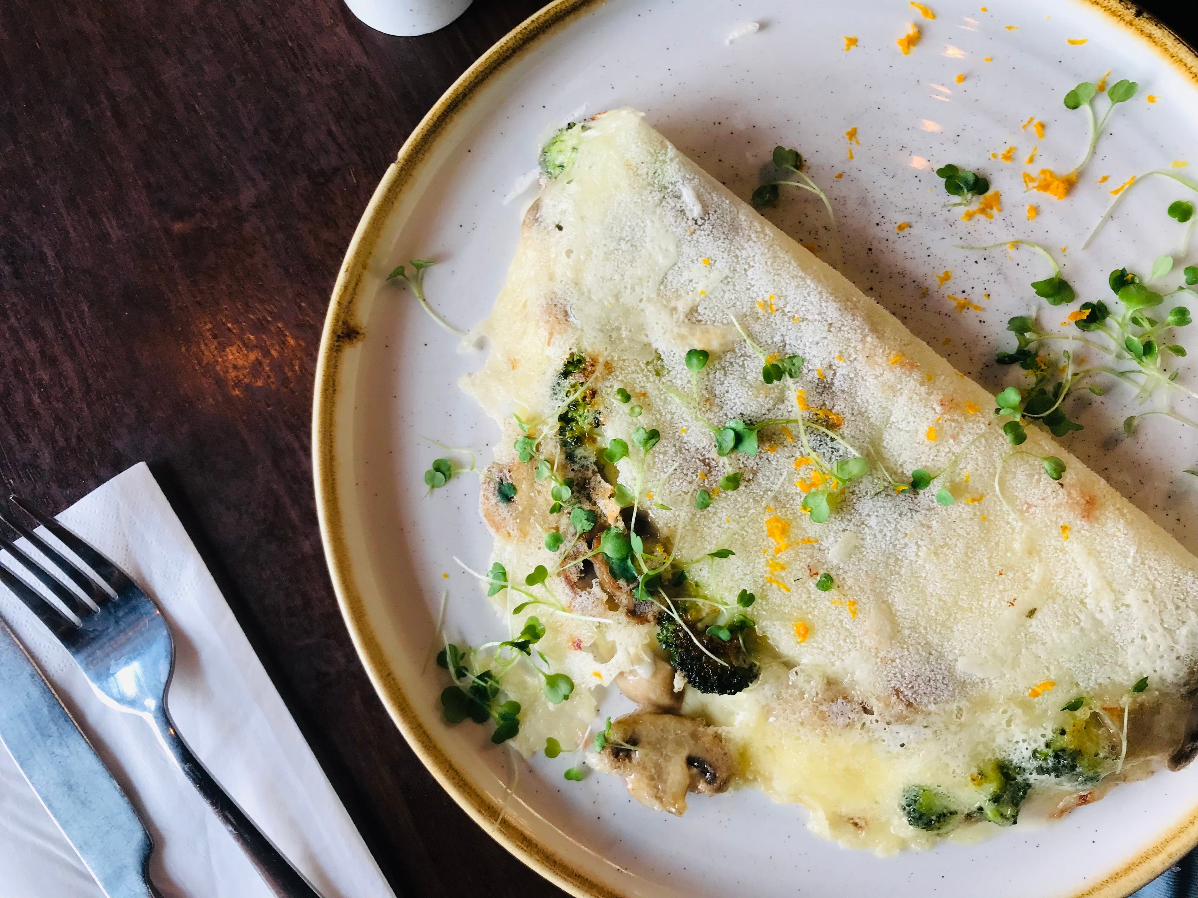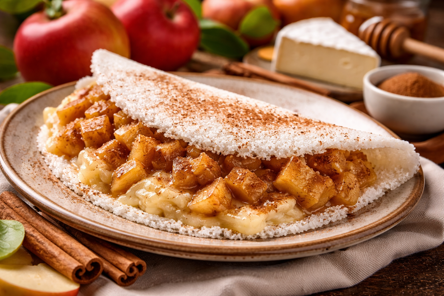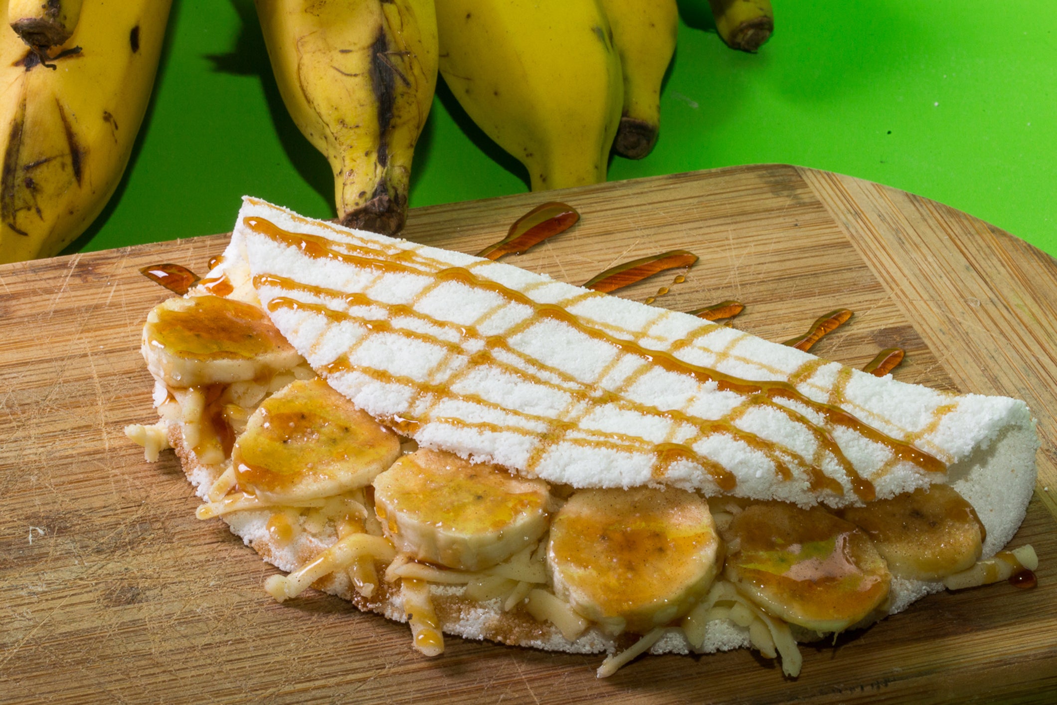Add your filling — cheese, fruit, vegetables, or whatever you like. Fold in half. Warm the filling briefly, or cover with a lid for extra softness.