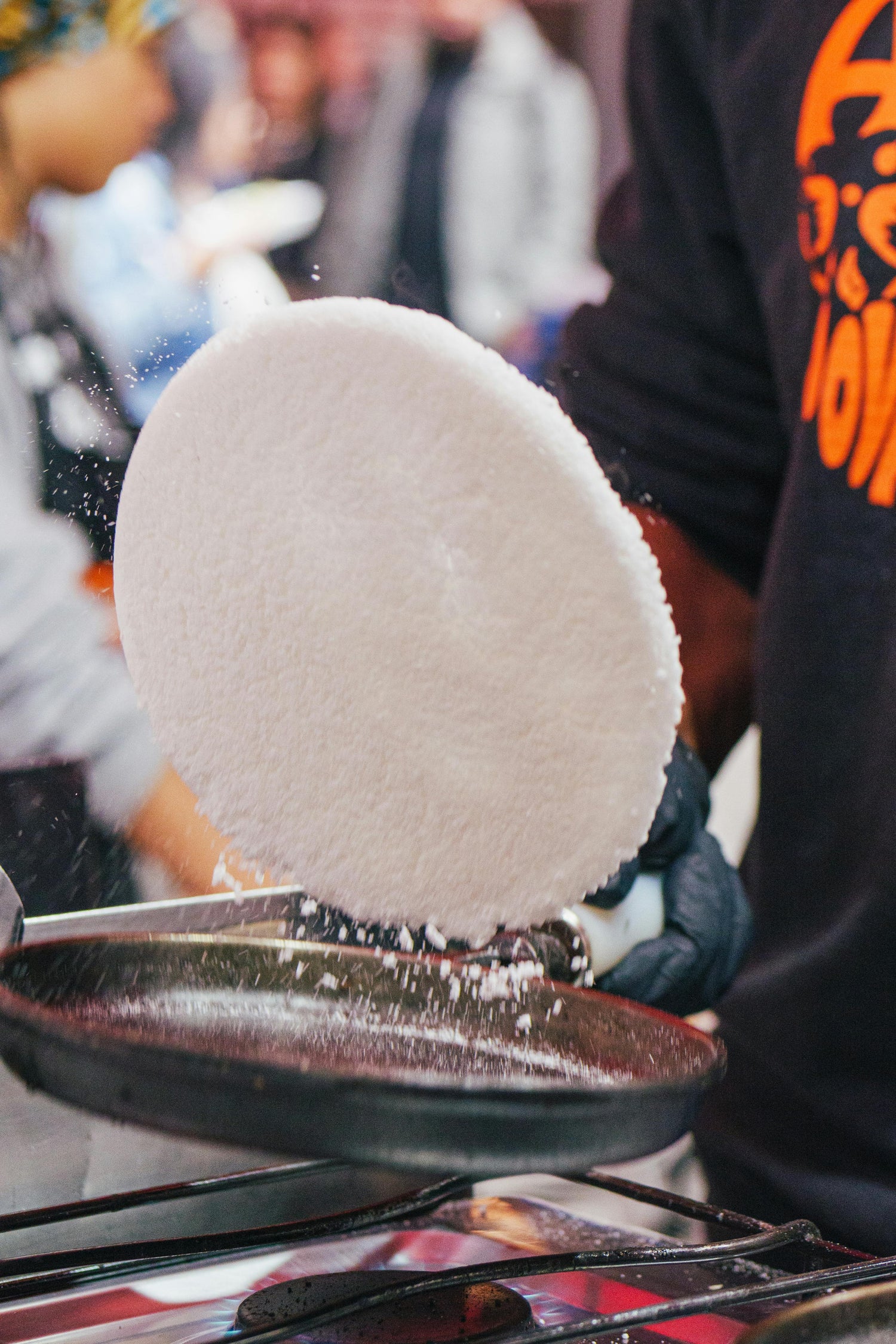 Once hot, pour the contents of one pack into the pan. Use a spoon to spread it evenly until it forms a round disc. Reduce heat to medium.